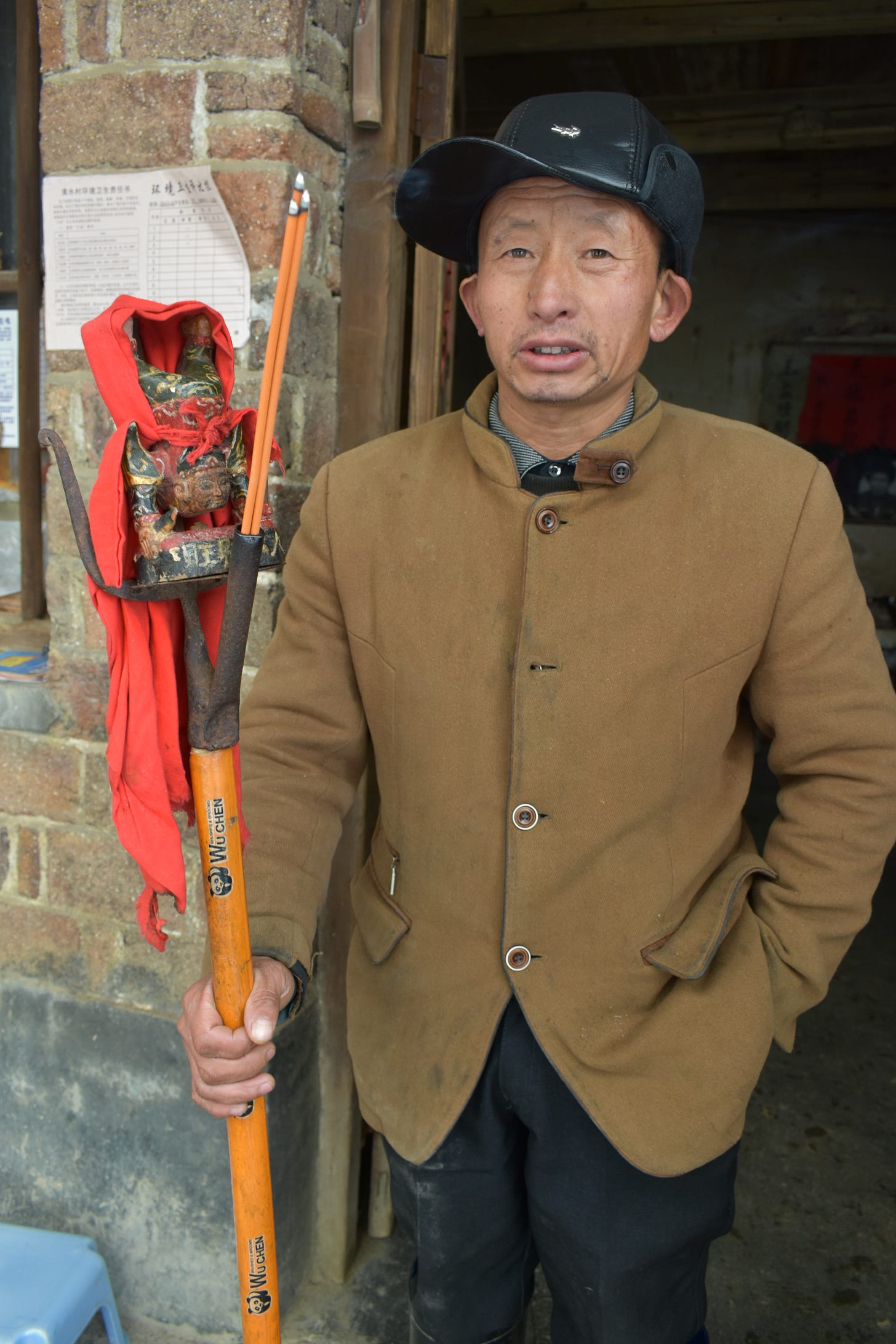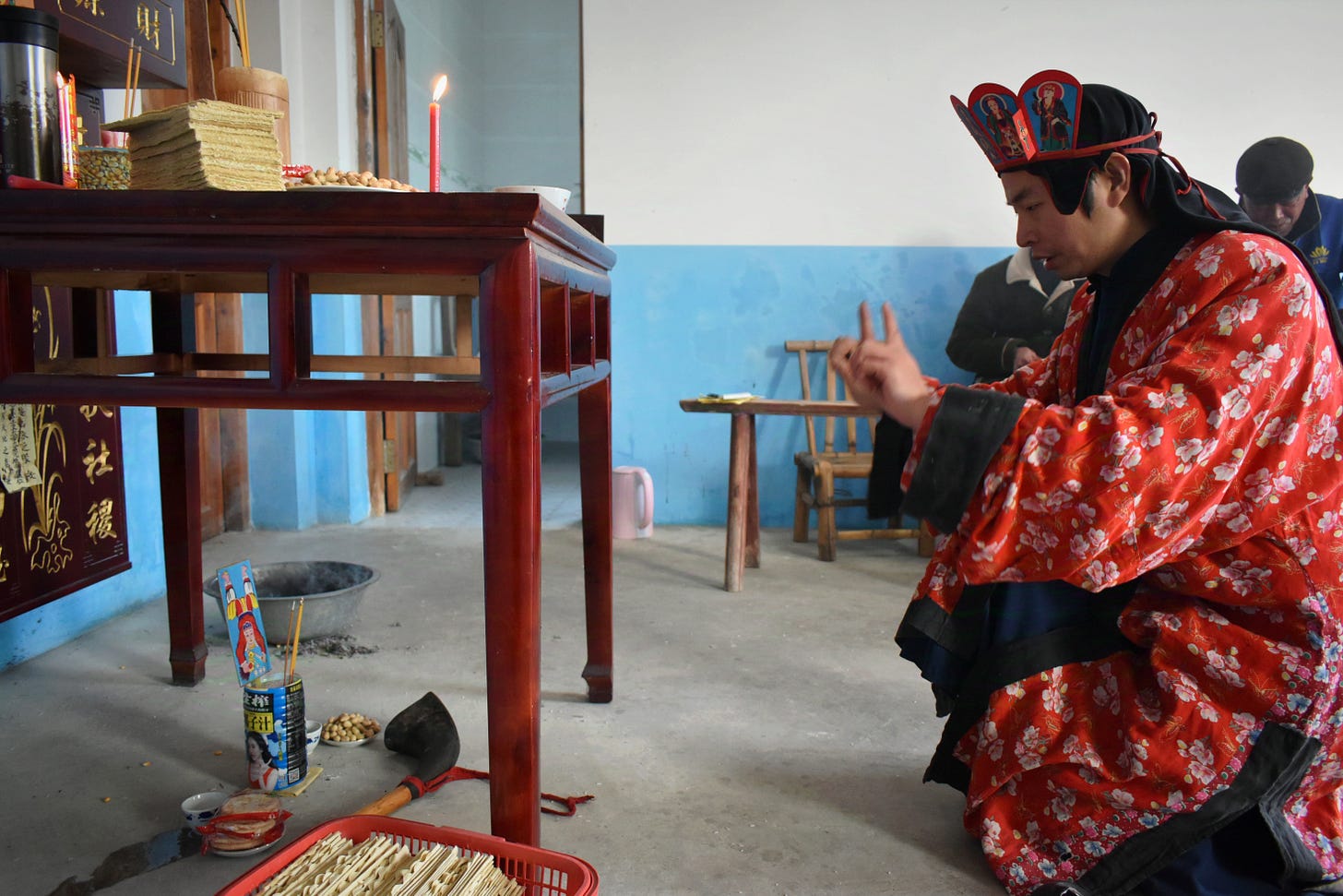 中国版TikTokの動画を手がかりにたどり着いた湖南省の「張五郎」信仰の現場。張五郎は気性の荒い神のため、机の下に祀るという photograph by Toru Otani