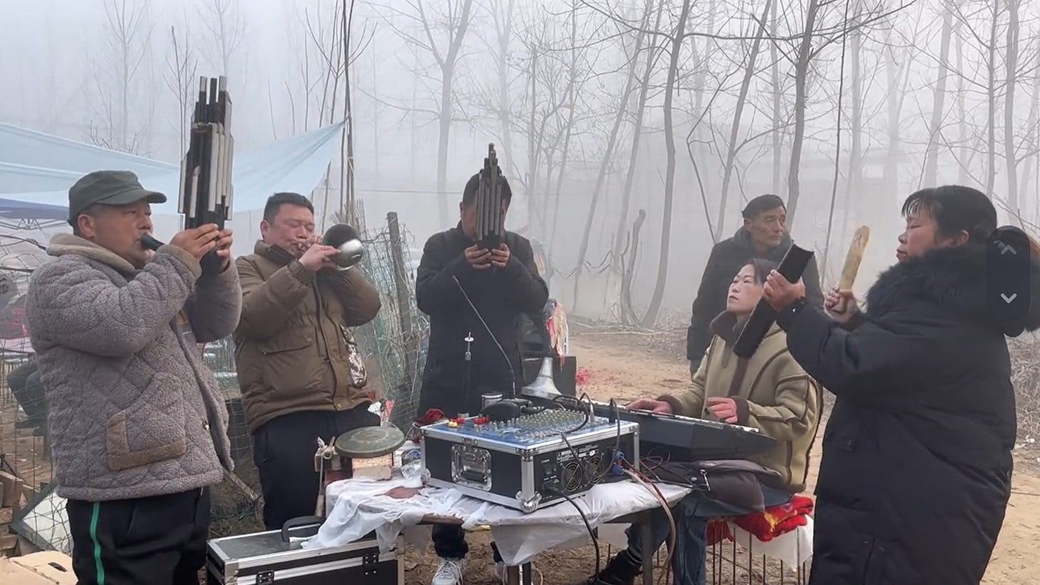 葬儀に関連してもうひとつ動画を紹介させてください。中国の農村では、葬儀の際に複製音源ではなく生演奏で故人を弔う伝統がいまだ根強く継承されています。地域によって使用される楽器は一様ではありませんが、チャルメラが主役となり、そこに笙・ミニシンバル・キーボードが加わるのが基本的な編成です。僕は勝手に彼らのことを「チャルメラバンド」と呼んで注目しているのですが、その演奏がまあ魅力的なんですよ。