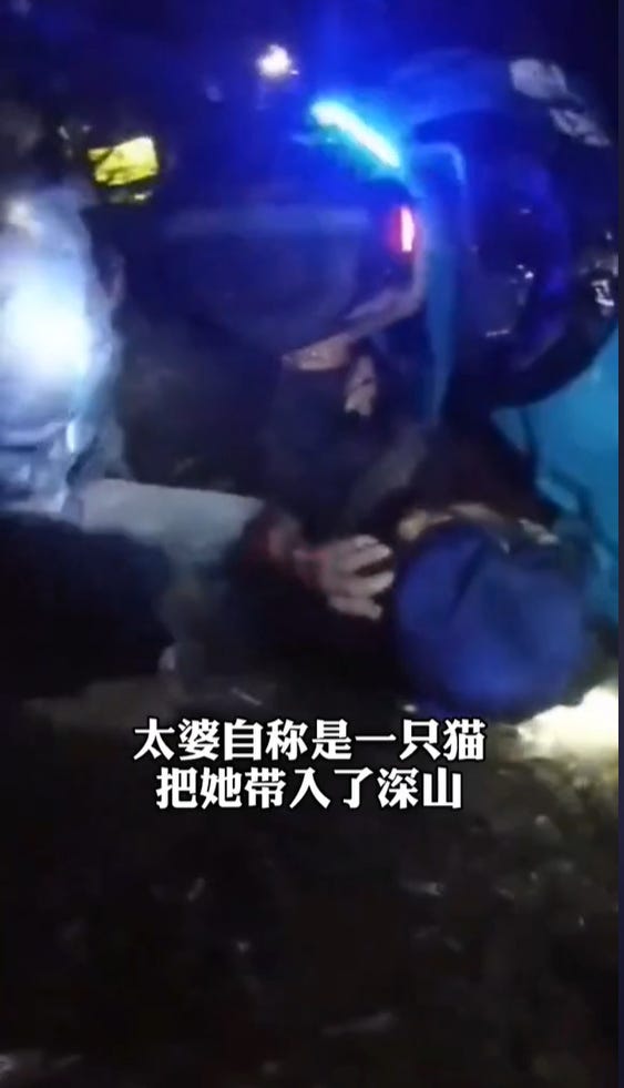 失踪老人動画の一例。画面内には「太婆自称是一只猫把她帯入了深山(猫に山奥に連れて行かれたとおばあさんは語る)」という文字が見える(動画リンク)