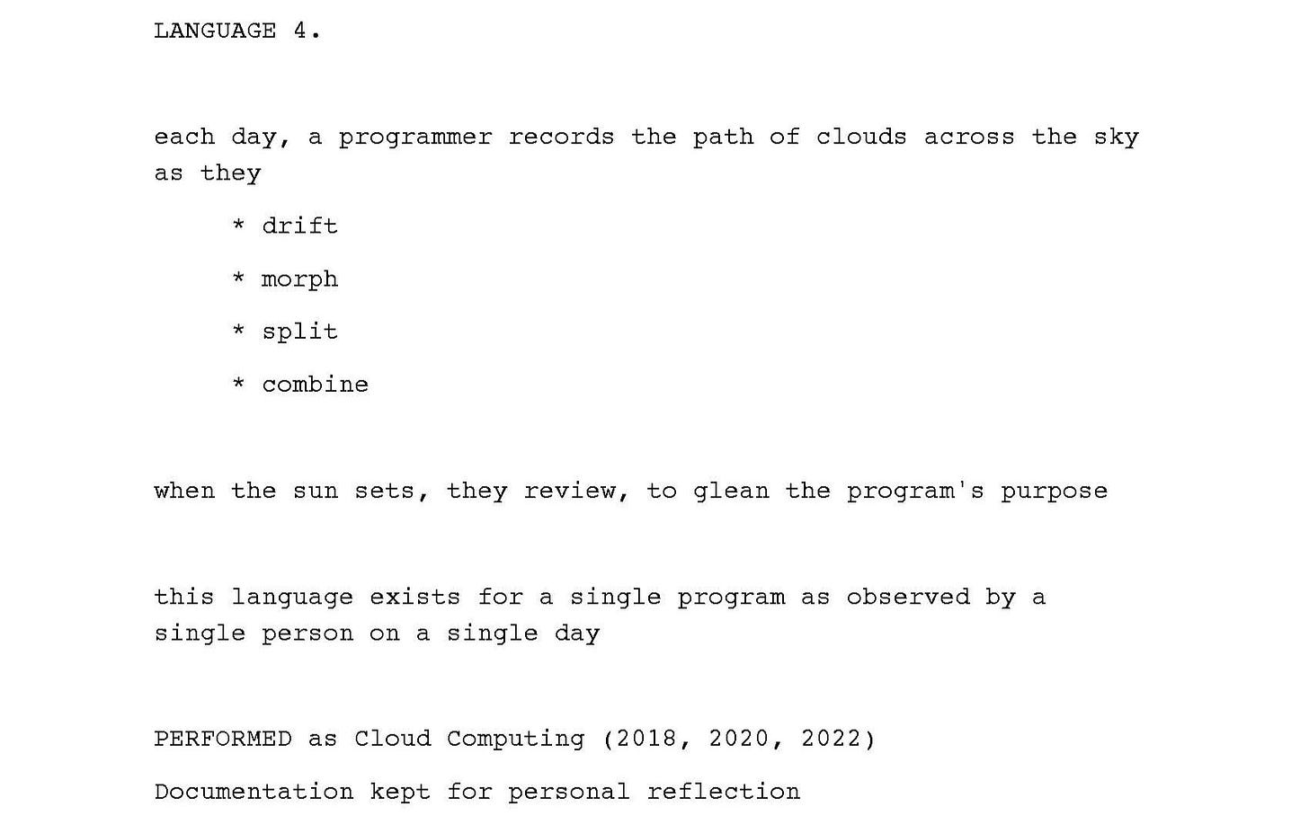 例えばわたしは「Cloud Computing」という言語をつくりました。この言語では、プログラマーが1日かけて空を漂う雲を観察し、雲が交差したり、相互作用したり、分かれたりする様子からアルゴリズムを構築します。雲の動きを一日中見つめ、プログラムについて瞑想する人によってつくられるのです。そのプログラムは、その日その人だけのために存在し、二度と再現されることはありません。もちろん、プログラムのコードは自分で制御できません。雲がそれを演じているからです。
