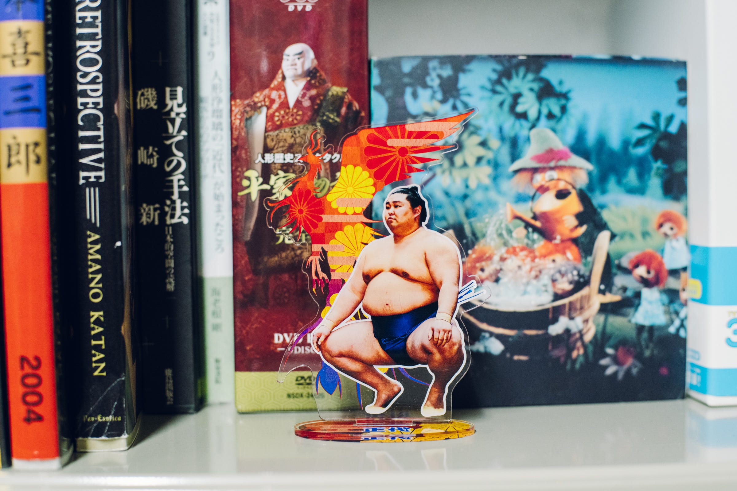 写真上:2024年12月に刊行されたNHKテキスト『こころをよむ 人形は人間のなんなんだ?』の表紙には、人形作家・片岡メリヤス氏の作品が使用されている 下:研究室の棚の上には、学生から譲り受けたアクスタのほか、2024年に菊地も参加した横浜人形の家「ひとはなぜ ひとがたをつくるのか」展で展示され大きな話題を呼んだ、人気スマートフォンゲーム『あんさんぶるスターズ!!』のキャラクター・斎宮宗のアクスタも飾られていた