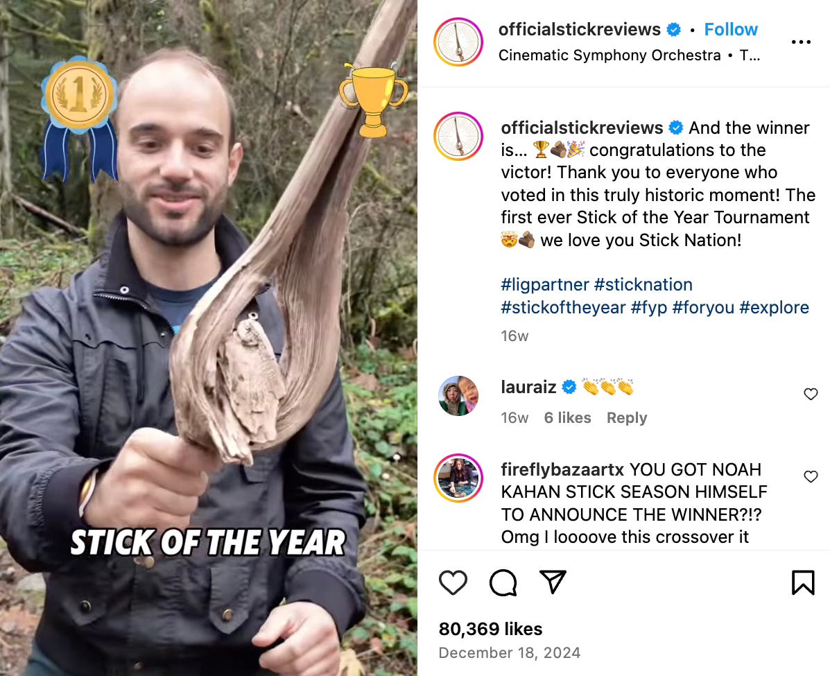 2025年4月現在、319万人ものユーザーがフォローするInstagramアカウント「Official Stick Reviews」には、お決まりの掛け声のあと各々がお気に入りの木の棒を紹介する動画がいくつも並んでいる。アメリカ・ユタ州育ちの青年ふたりが立ち上げたコミュニティが、「インターネット上で最も心温まる空間」として、これだけの人に愛される理由とは。当の運営者たちに聞いてみた。