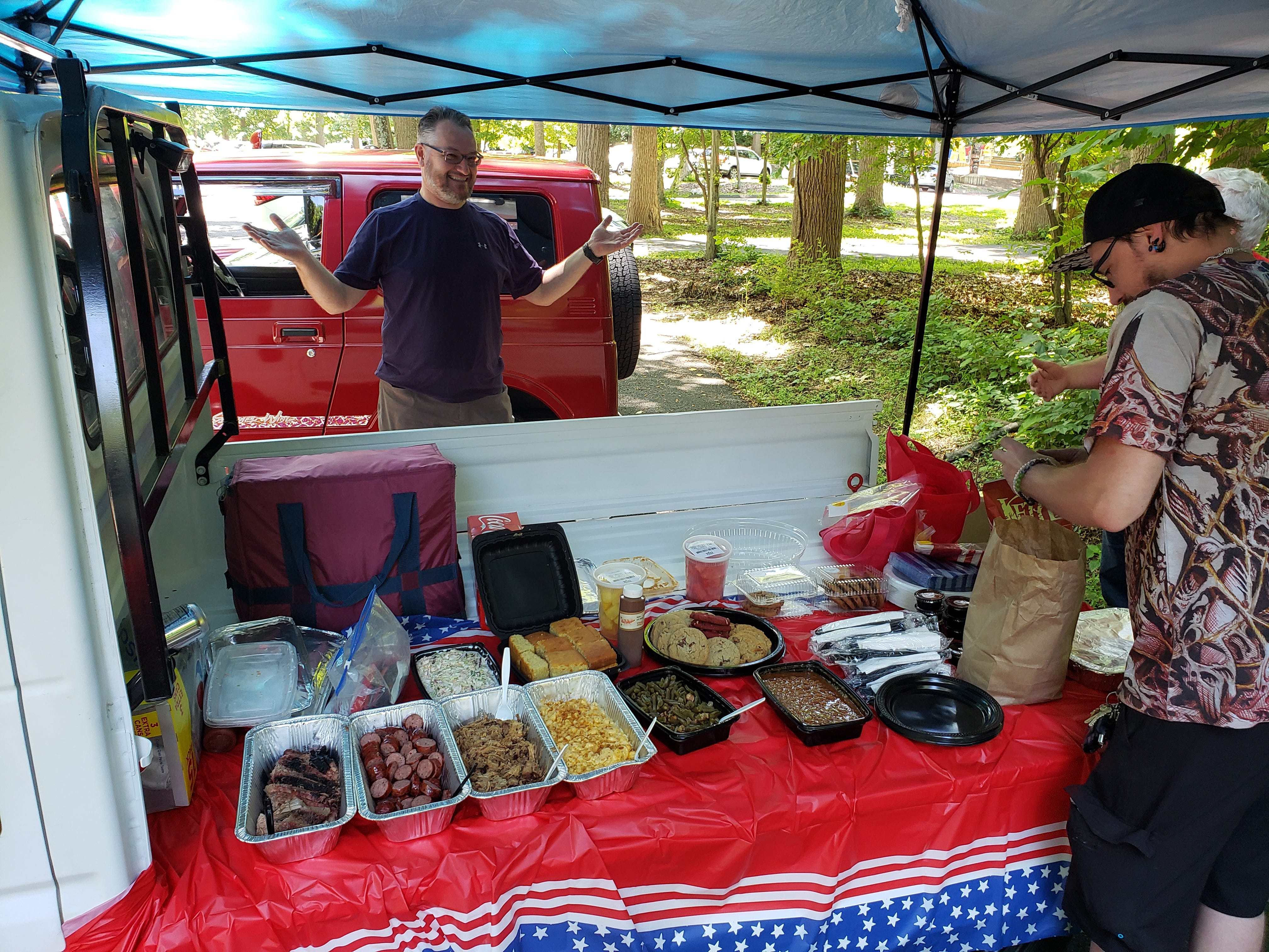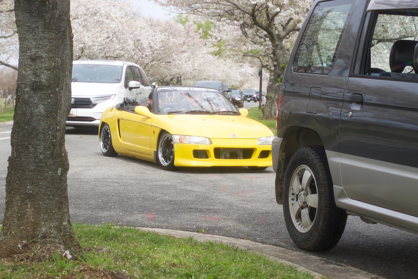 また、年に2回大型イベントを開催していて、春にはワシントンD.C.の桜並木でドライブしながらお花見を、夏にはバーベキューを企画します。直近のイベントでは、軽自動車だけで40台、さらに日本車を含めると80台以上が集まりました。バーベキューだけでなく、帽子やステッカー、ピンバッジなどマーチの販売や、日本のお菓子や雑誌、カーパーツ、ステッカー、アクセサリーなどを景品とした無料のラッフル(抽選会)も行いました。