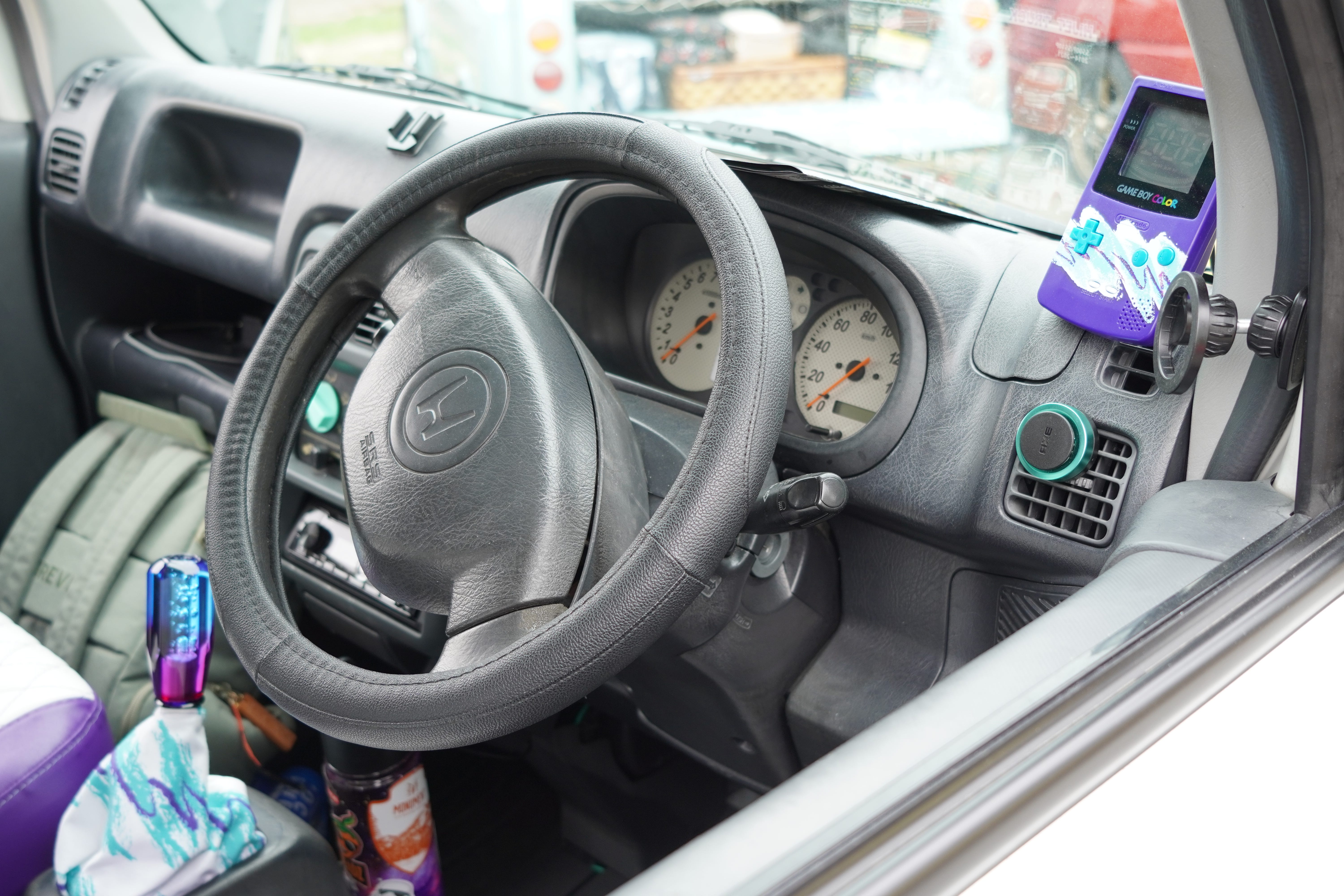 CKCCメンバーが所有するホンダ「アクティ」の運転席。任天堂が発売した携帯型ゲーム機「ゲームボーイカラー」が車内に取り付けられ、シフトレバーがデコレーションされている