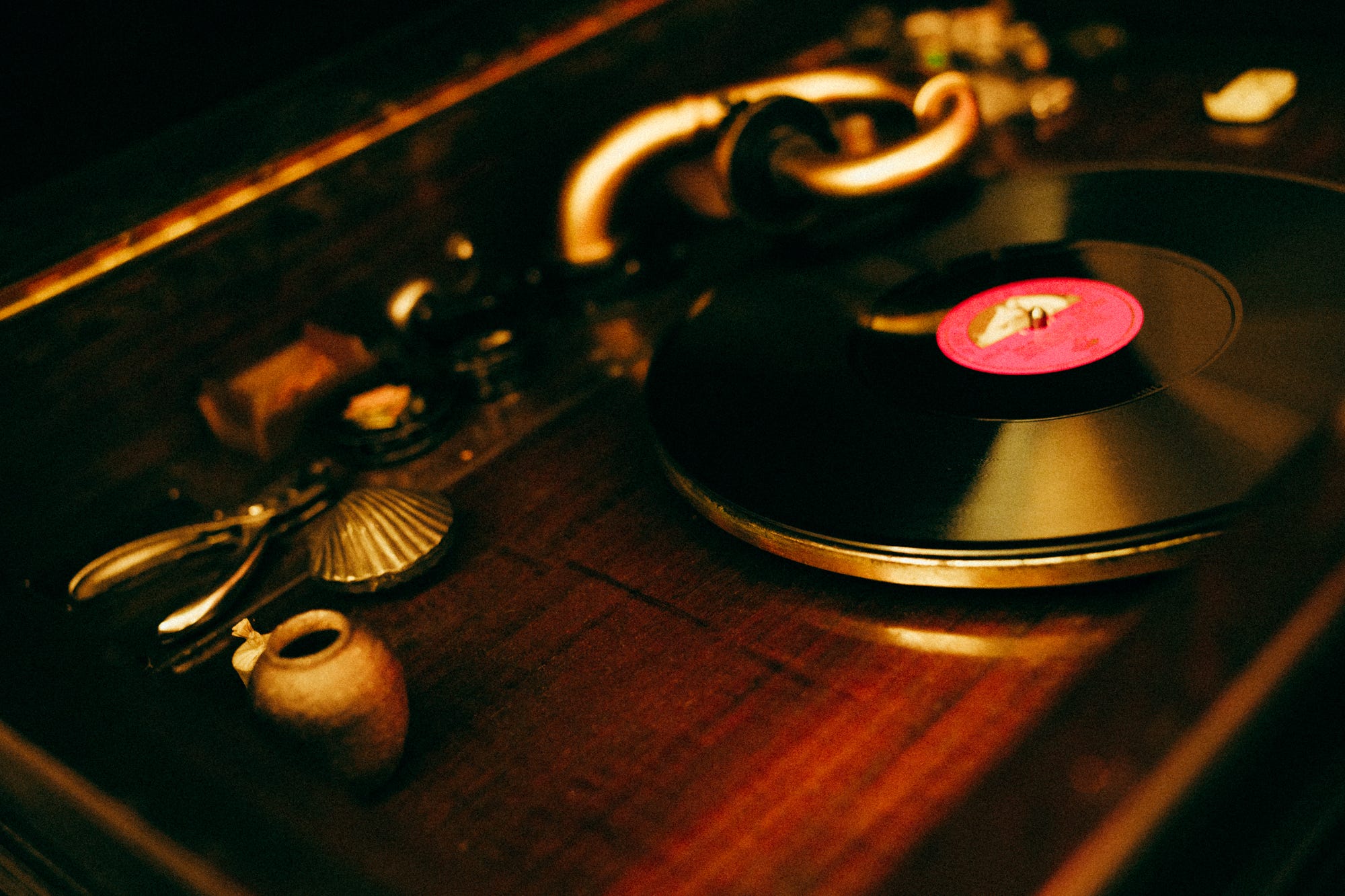 防音設計が施された音楽室(上)。壁面に埋め込まれた、縦約3m×横5m超の巨大スピーカーシステムと、音を拡張させる半円形のコンクリート響板が存在感を放つ。室内にはSP盤再生に用いられてきた蓄音機(下)をはじめ、オーディオマニアを唸らせる名器が揃う