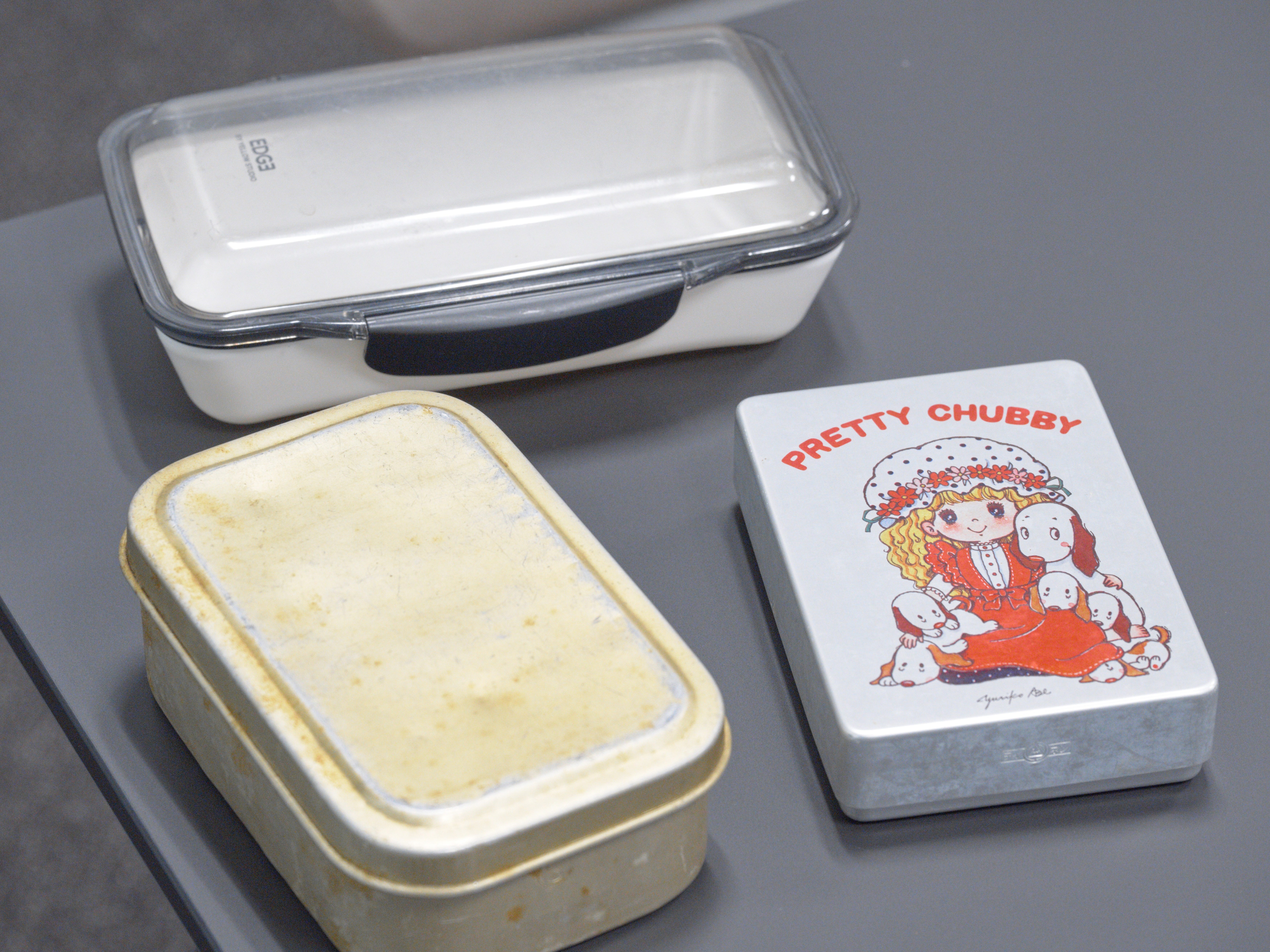 (上)取材は港南のコクヨ品川オフィスにて行われた (下)湯澤氏が保管している弁当箱。左下は母の世代(団塊世代)が使っていたアルマイト製の弁当箱、右下は湯澤氏が使っていたキャラクタープリントのあるアルマイト製の弁当箱、上が湯澤氏の息子が使っていたプラスチック製の弁当箱。弁当箱から時代の変化が窺える