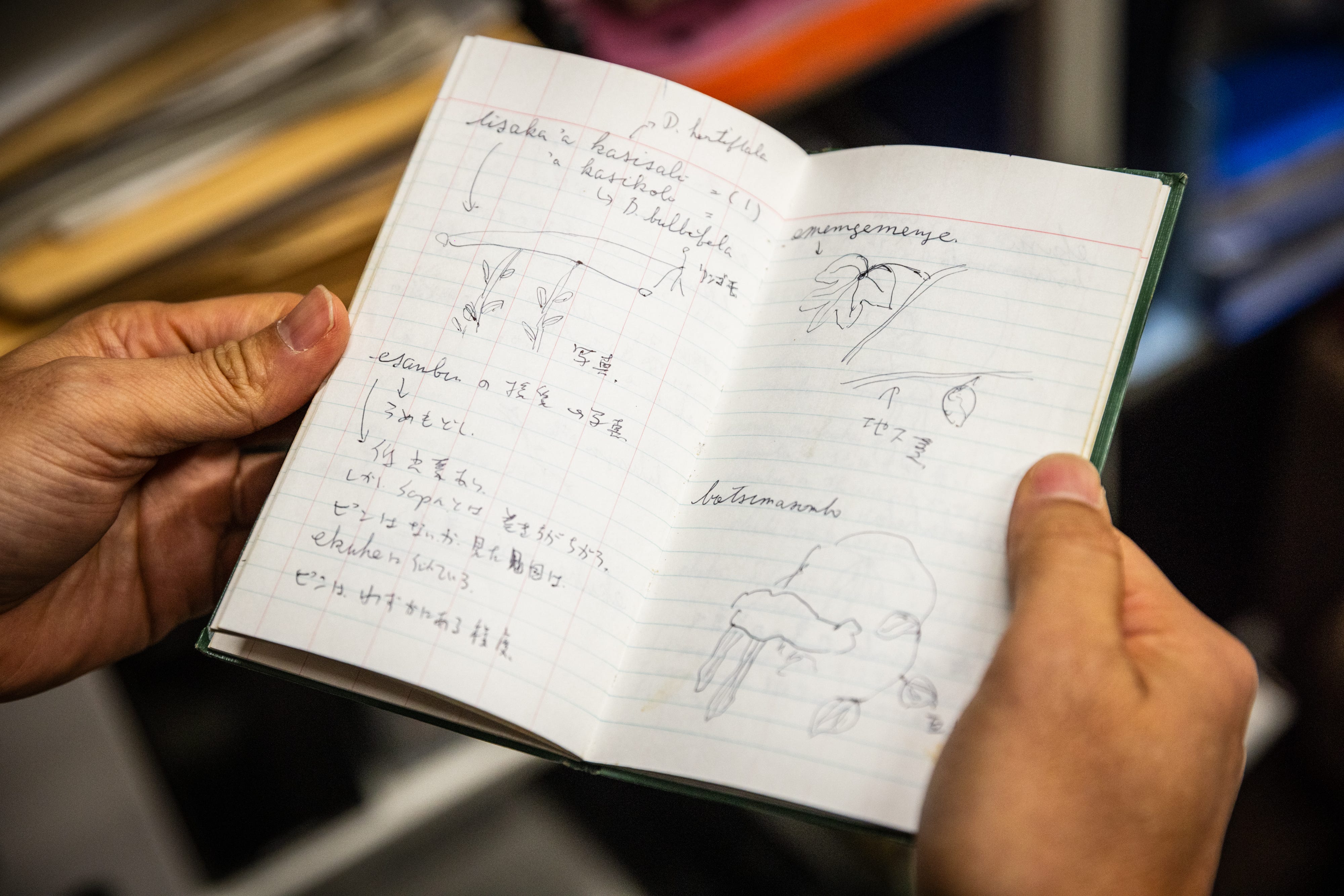 インタビュイーである安岡宏和さんのフィールドノートより、カメルーンの狩猟採集民「バカ」が”半栽培”するヤマノイモのスケッチ。野生のヤマノイモを、現地の人びとはうまく狩猟採集の生活のなかに取り込んできた