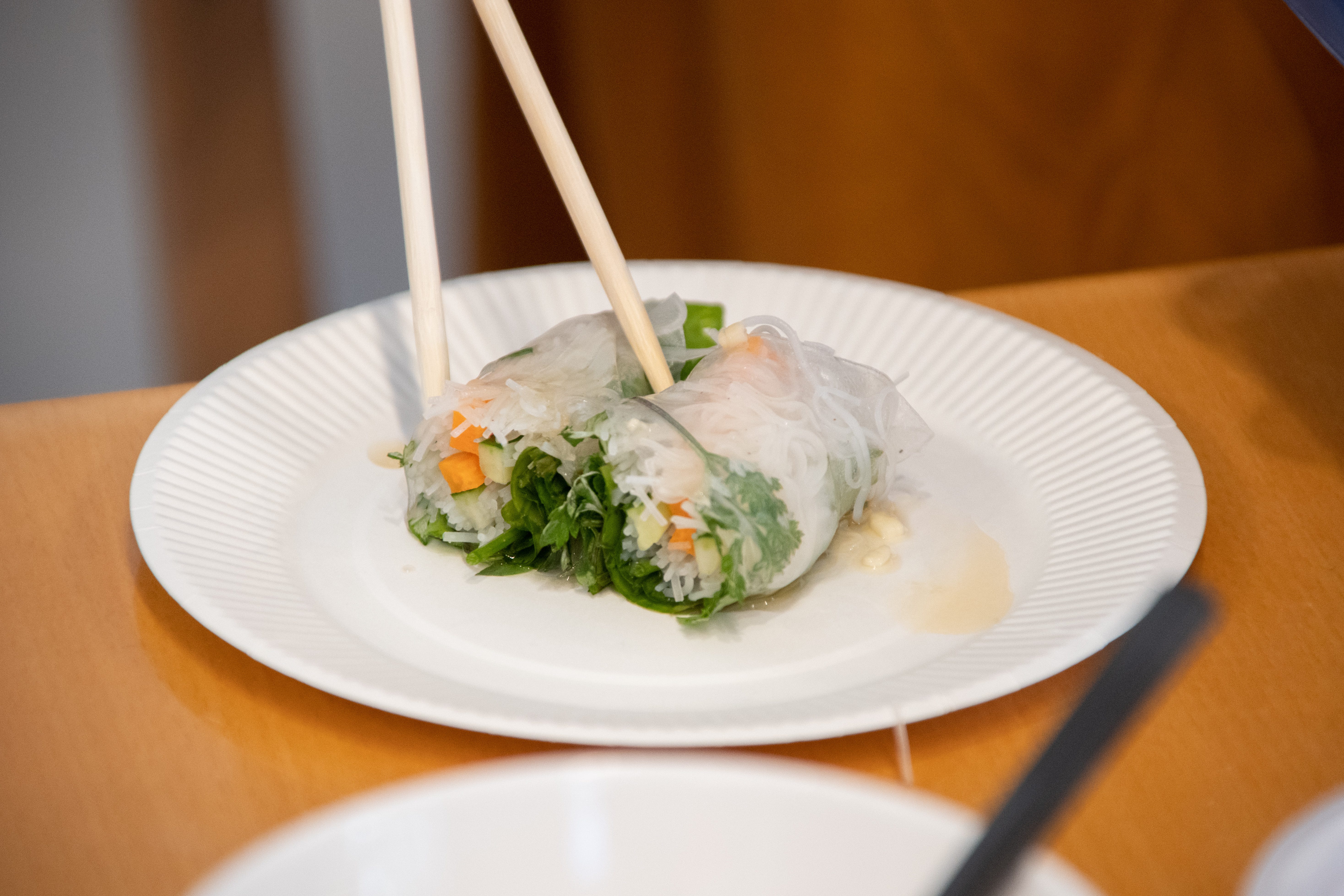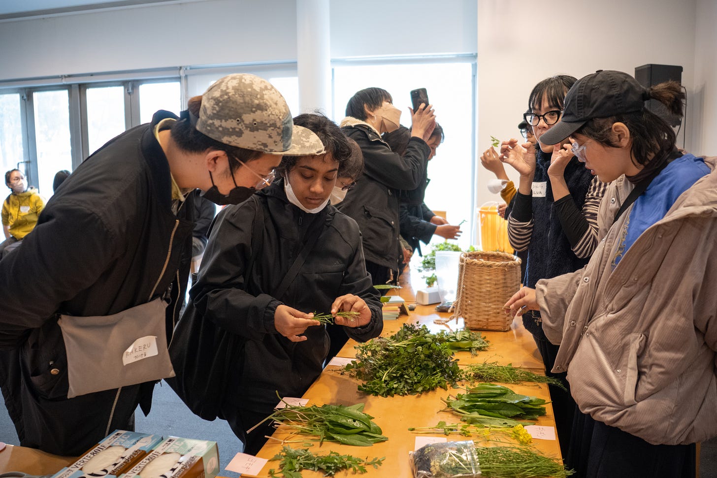 90分程度の野草採取フィールドワークを終えてYCAMに戻ってきた一行は、野草を改めて観察。匂いを嗅いだり、齧ったりしながら感想を述べ合った。昼食に合わせて野草は洗浄(一部は加熱処理)した上で、生春巻きやサラダにして振る舞われた。インドネシアの伝統料理に熱心なスワスティアストゥ・モニカ氏がつくって持参したピーナッツソースや、岩光氏がおすすめの食べ方と紹介した味噌汁など、どれも好評で、摘まれた野草はあっという間に卓上からなくなった