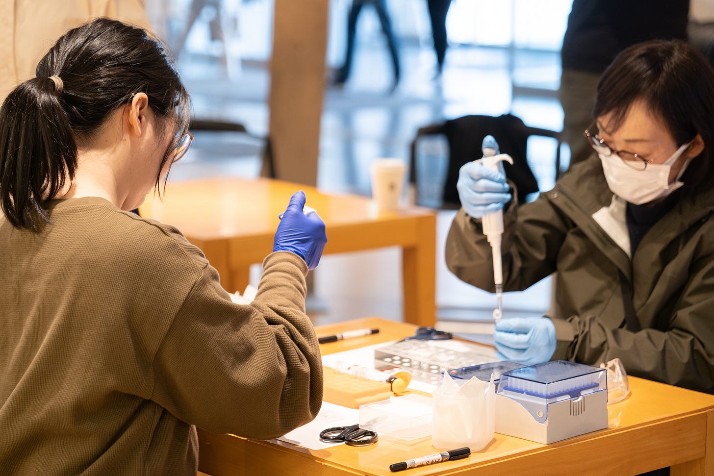 DNA抽出ワークショップの一場面。ひとりの参加者を除いて、マイクロピペットを触ることすら初めての人がほとんどだった