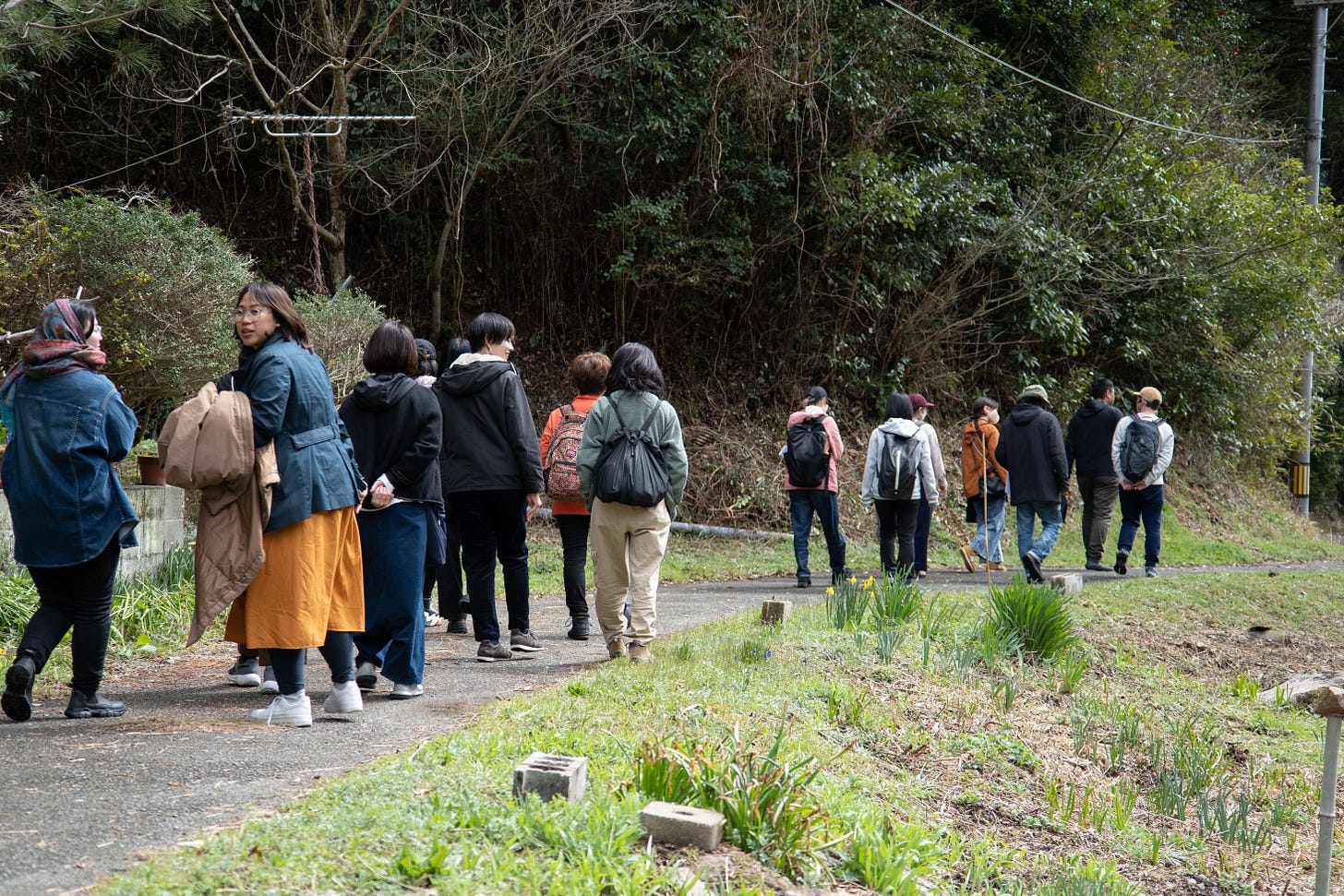 山口の里山の野草と向かい合う、ワークショップ参加者とバクダパンのメンバーたち