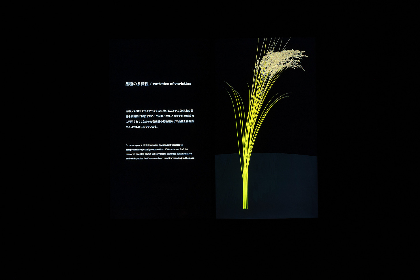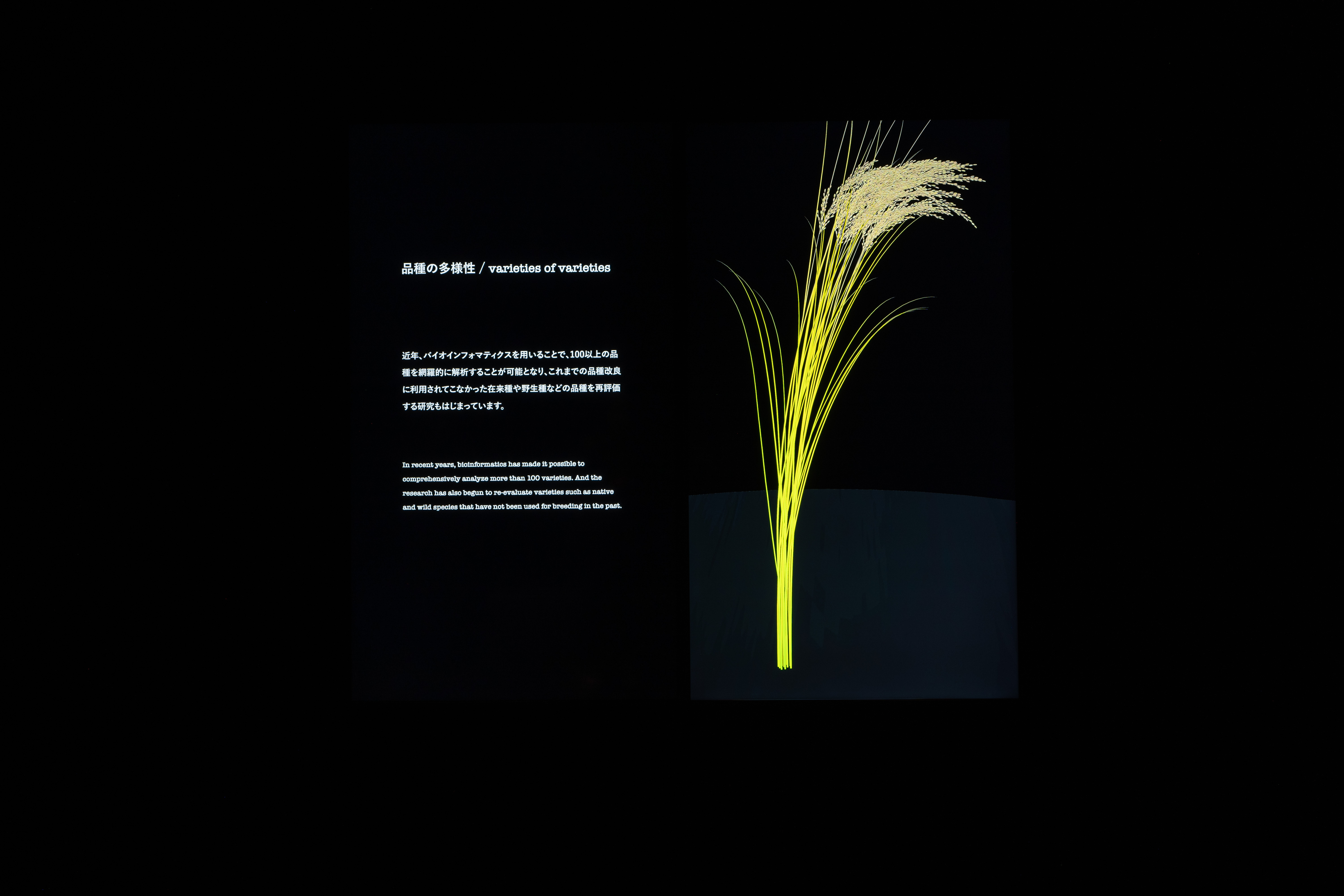 YCAMバイオ・リサーチが建築系プログラマーの堀川淳一郎氏と共同制作した「Rice Breeds Chronicle」。イネの品種ごとの特徴と形状が実寸大で表示され、まさに過去から現在に至るクロニクルとして観客に伝わる