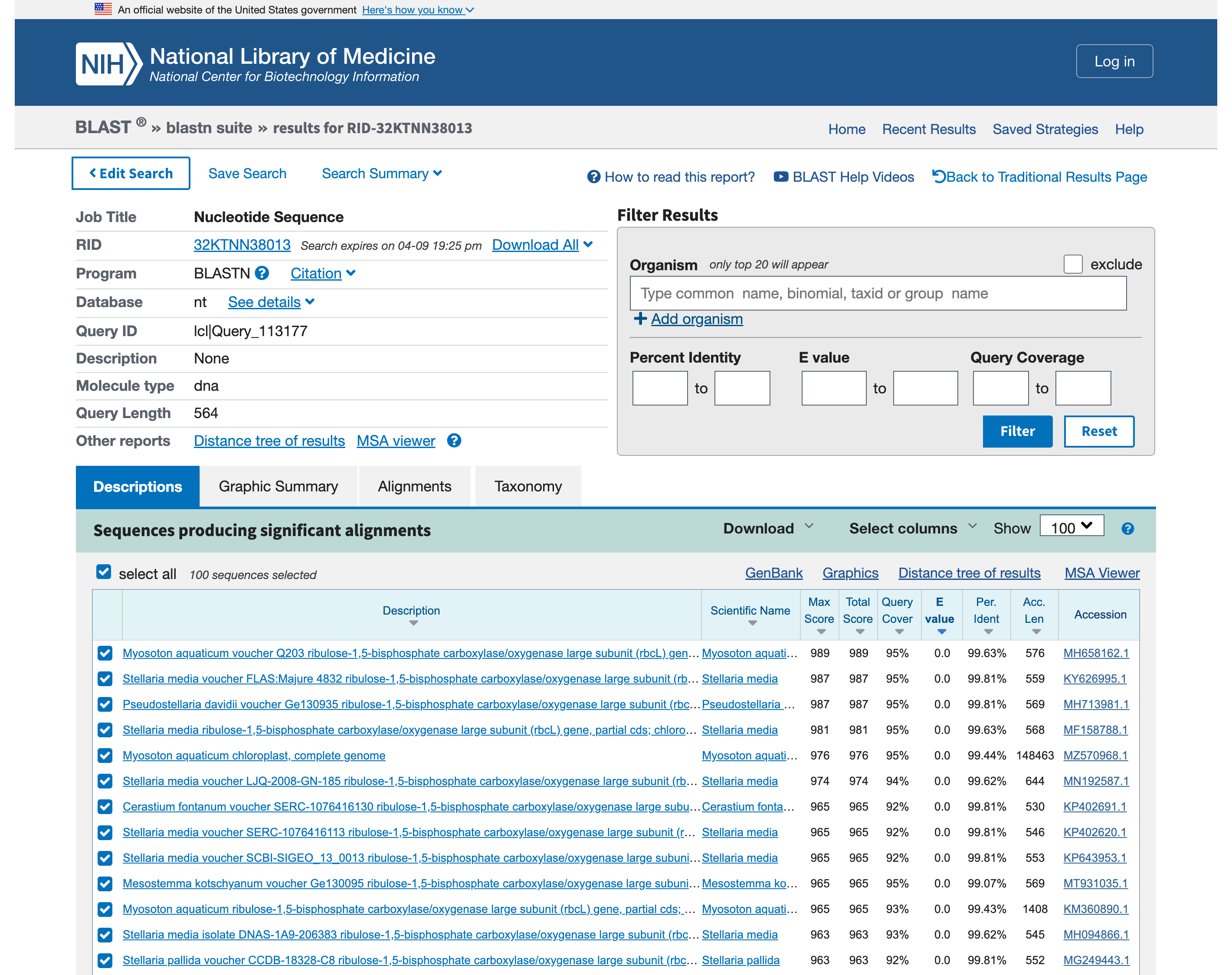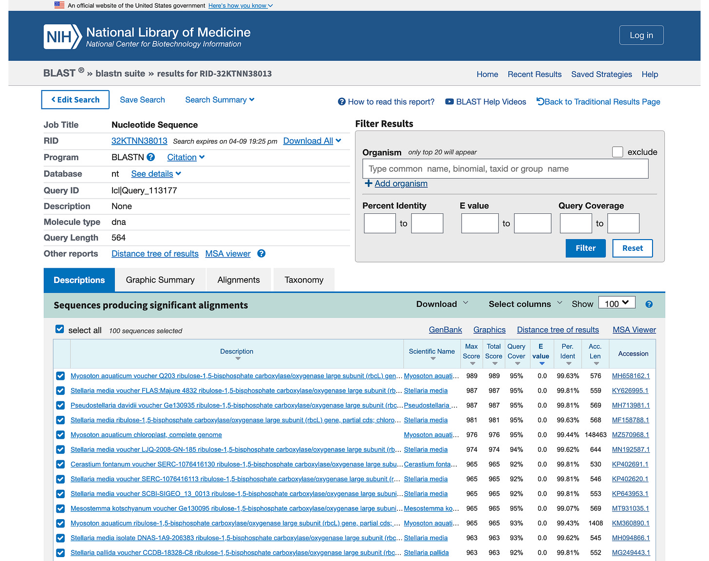 DNAの相同性検索プログラム「BLAST」のウェブサイトより。参加者の手元に届く塩基配列データを検索すれば、自分たちが採取したものと類似した植物を知ることができる Screen capture by Kakeru Asano