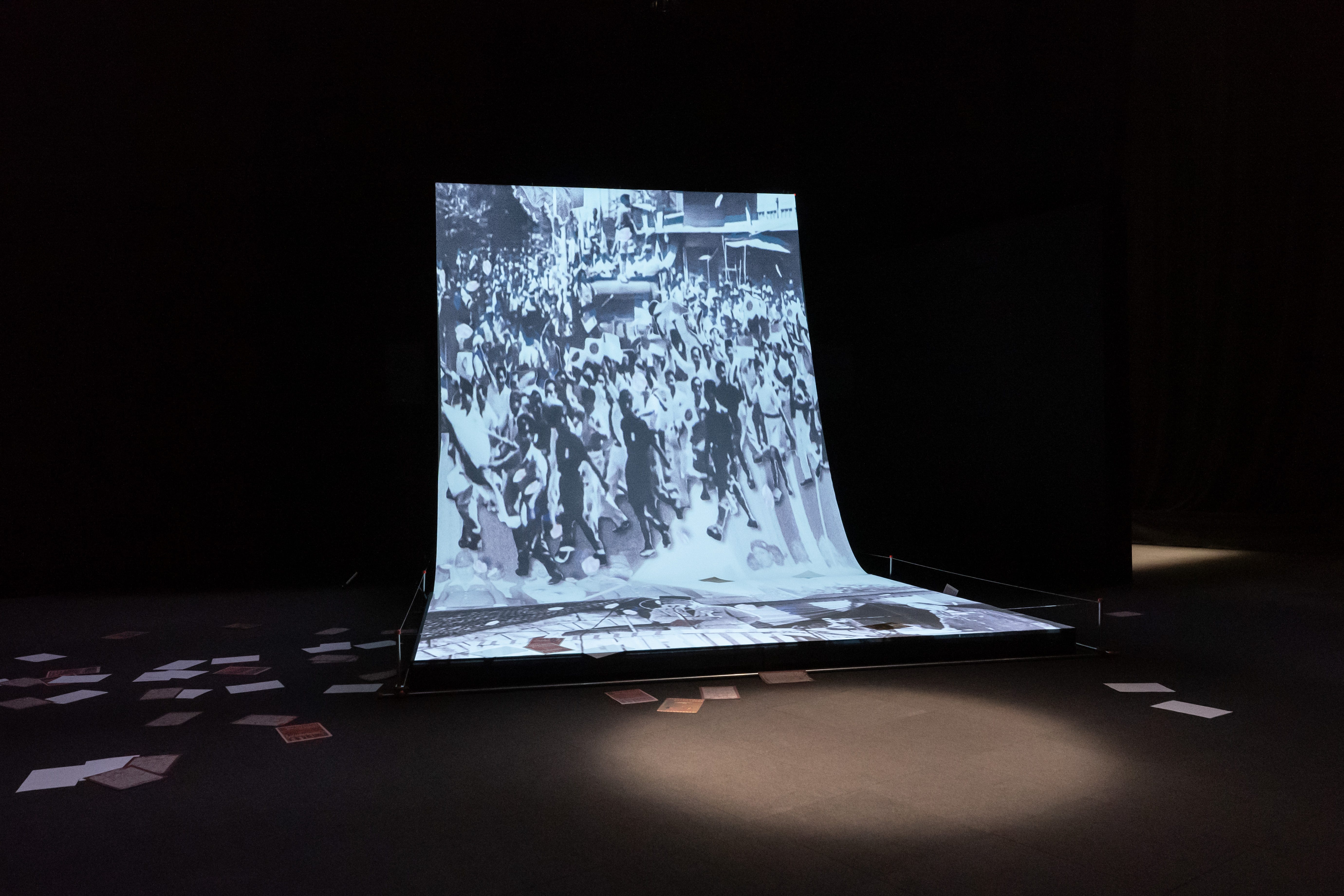 食糧政策とバイオテクノロジーの密接な関係を想像した後は、日本が植民地支配を拡大していた当時の映像や音声、追加で描かれたイラストなどが編み込まれた映像インスタレーションの「Along the Archival Grain」だ。眺めていると、天井から紙が舞い落ちてきた。よく見ると「開発の傷の中で喜べ!/BERBAHAGILAH DALAM LOEK PEMBANGOENAN! 」と書かれている。天井付近に備え付けられたプリンターからビラが定期的に印刷され舞い落ちてくる様からは、まさに文化的同化政策を想起させられる。