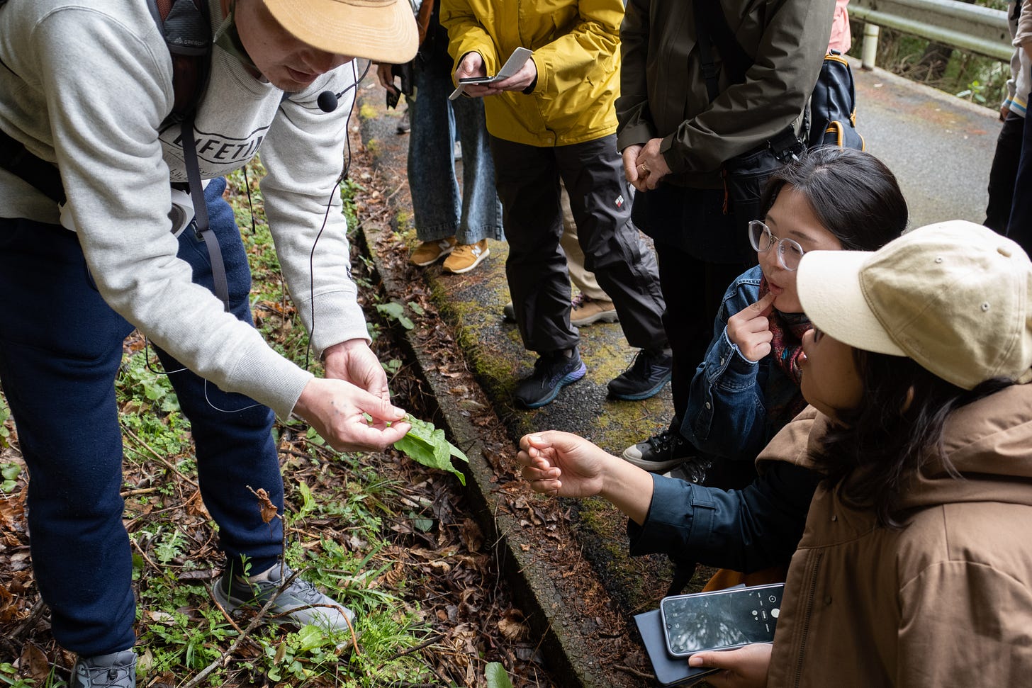 山間の目的地に到着すると、大工であり、野草に造詣の深い岩光大祐氏が参加者を迎えてくれた(野生のサルも)。経験豊かな岩光氏のアドバイスを聞きながら、バクダパンのメンバーと参加者らが、食用の野草を自ら摘んでいく。すでに2022年10月のフィールドリサーチで野草採取を行ったバクダパンのメンバーは、「これは生でいけた?」「火を通すやつ?」と岩光氏に確認をしながら、参加者とともにスイバやギシギシ、アザミなどを採取していく。YCAMに戻って観察した後、みなでおいしく食した。