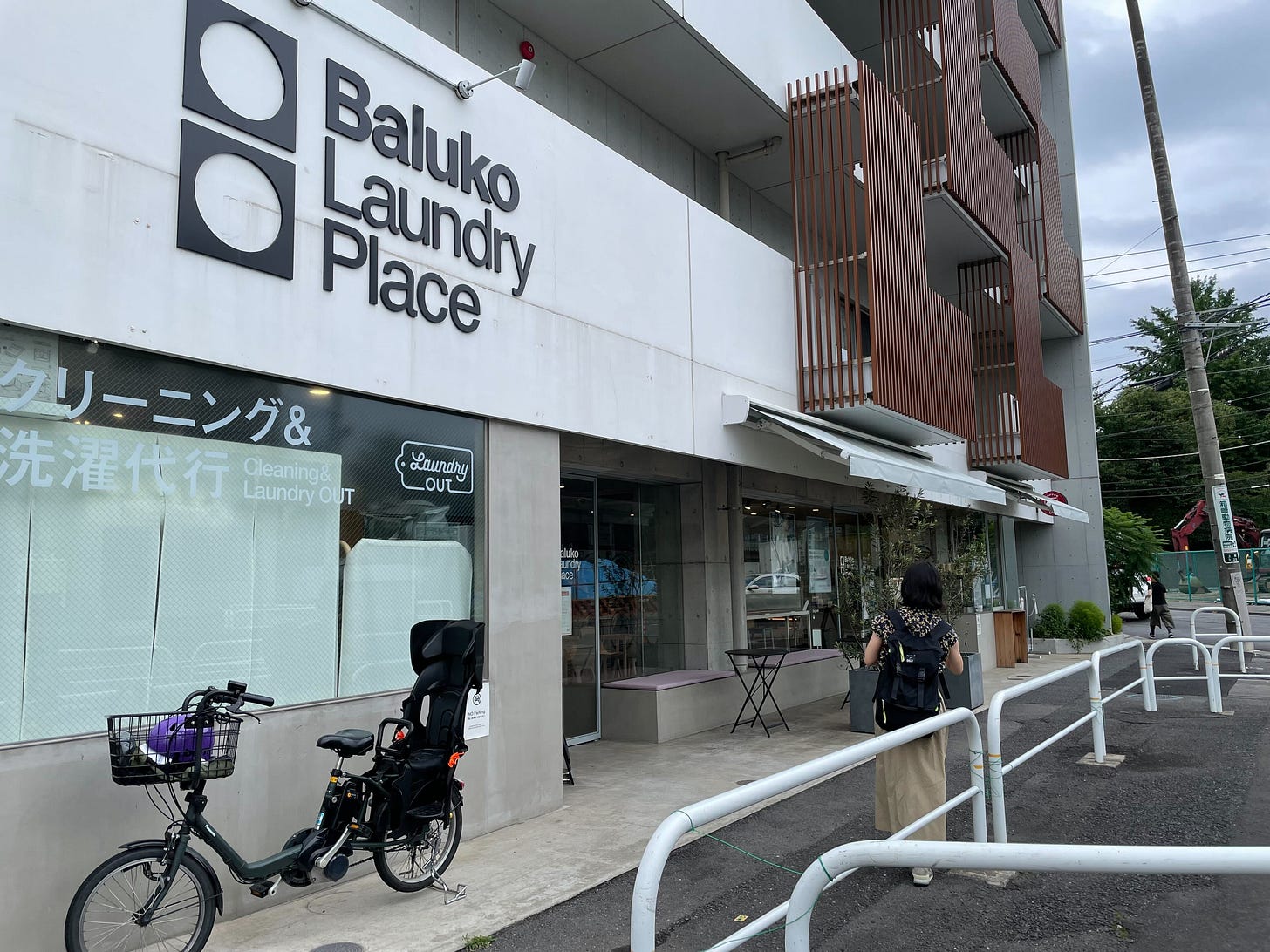 渋谷区にある〈Baluko Laundry Place代々木上原〉入り口。大きく設けられたガラス窓のおかげで、店内は明るくオープンな空間になっている。取材担当はWORKSIGHT編集部の古屋将太・鳥嶋夏歩。(photograph by Shota Furuya)