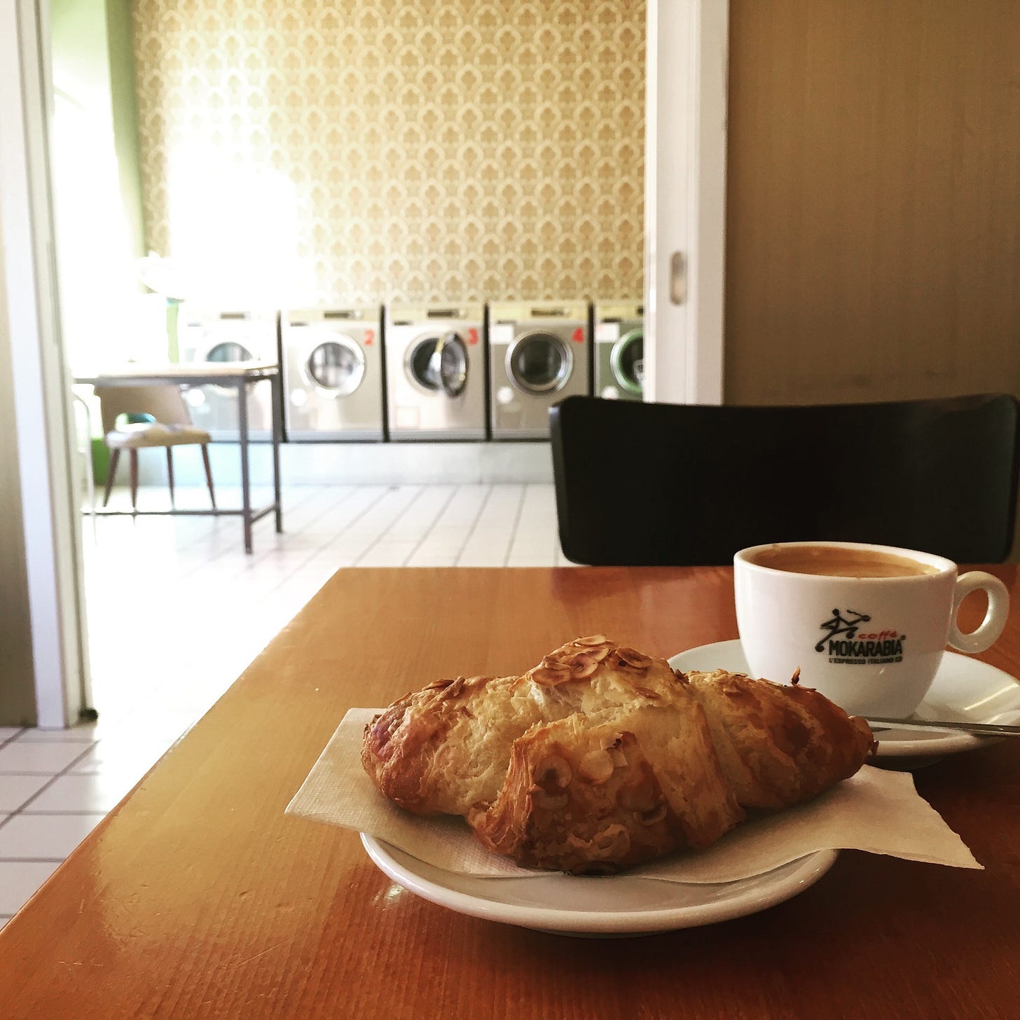 長年のコインランドリーユーザーである古屋。国内外のランドリーを使いながら、その可能性について思いを巡らせ続けてきた。写真上はデンマーク留学中に愛用していたコインランドリー。写真下は仕事で訪れていたベルリンにて、コインランドリーに隣接されたカフェスペースでの1枚。空き時間においしいコーヒーや食事を楽しむことができる。(photographs by Shota Furuya)