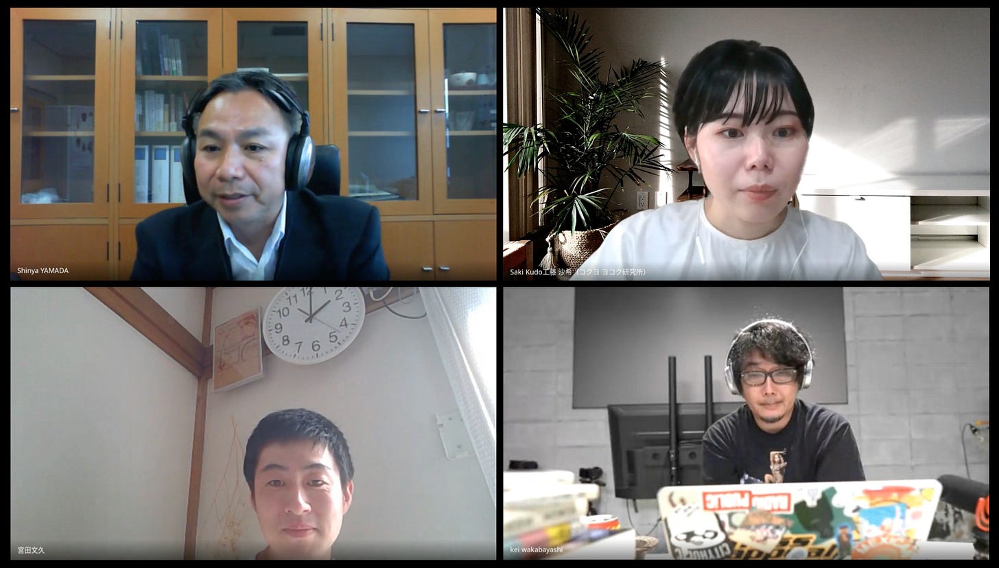 9月半ばに行われたオンライン取材。左上は山田慎也先生。葬儀に関するスペシャリストで、投げかけた質問に何でも答えてくださりインタビュー時間があっという間に感じた。「葬儀」にはまだまだ面白いテーマが潜んでいそう。WORKSIGHT編集部からは、執筆を務めた工藤沙希(右上)・フリー編集者の宮田文久(左下)に加えて、WORKSIGHTコンテンツディレクターの若林恵(右下)も取材に参加。