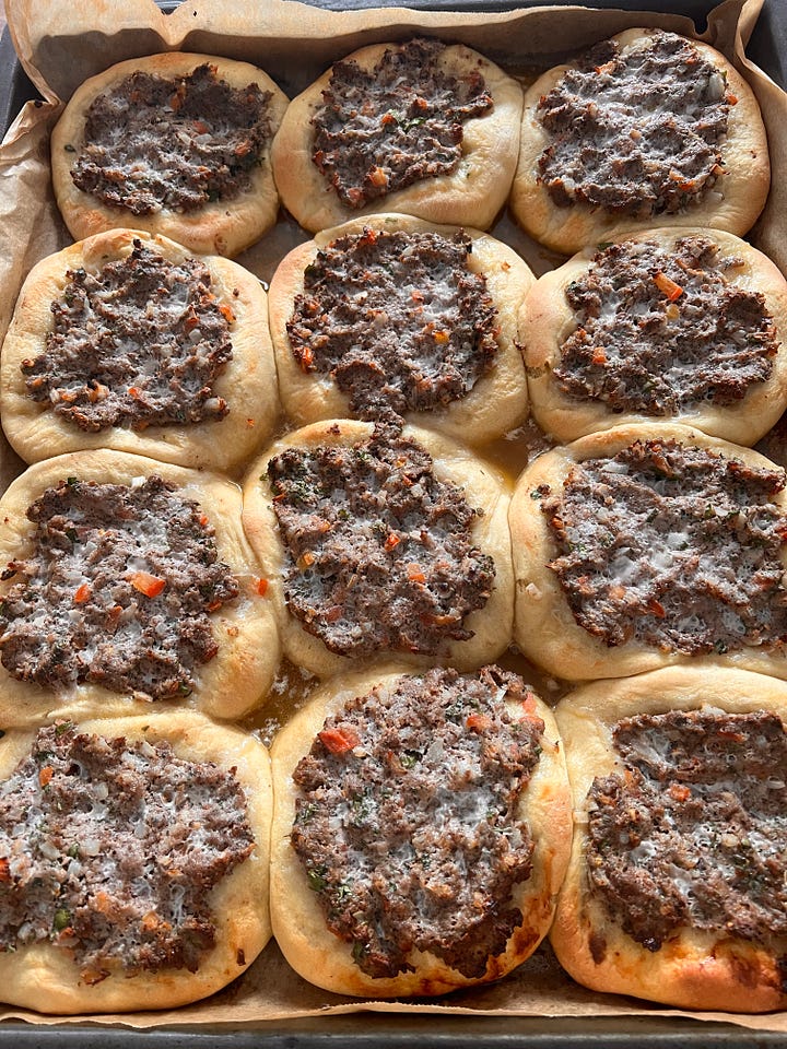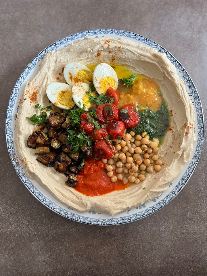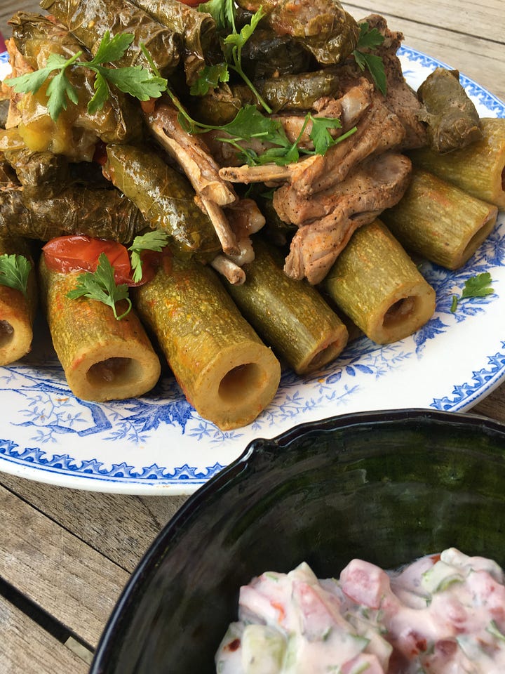 左上から時計回りに:マクルバ/スフィーハ。パレスチナのラムを用いたパイ/ナスやトマトをトッピングしたフムス/ワラク・イナブとズッキーニ。ブドウの葉に詰め物をした、サミの幼少時代のお気に入り